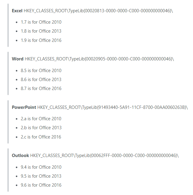 ※ MS Office 버전별 레지스트리 경로 및 버전 넘버는 아래 이미지 참조.